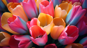 A vibrant bouquet of tulips in shades of blue, pink, orange, and yellow bursts with vivid color and delicate petal details. Download this free AI Generated blue, closeup flowers, colorful petals, and orange stock image by Image Maker (@ImageMaker).