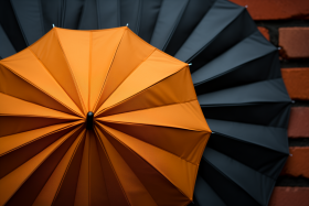 A bright orange umbrella stands out against surrounding a black umbrella, set against a textured red brick wall for a bold, stylish contrast. Download this free AI Generated , black umbrellas, brick wall, and fashion accessory stock image by Image Maker (@ImageMaker).