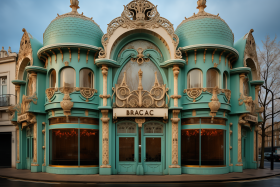 An elaborate Art Nouveau building with turquoise walls, sculpted columns, and intricate ornamental designs, evoking vintage elegance and architectural artistry. Download this free AI Generated architecture, art nouveau, decorative details, and historic building stock image by Image Maker (@ImageMaker).