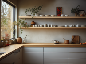 A serene, minimalist kitchen with light wood countertops and open shelves displaying white ceramics, plants, and kitchenware, bathed in warm daylight from a large window. Download this free AI Generated ceramics, clean, greenery, and home interior stock image by Image Maker (@ImageMaker).