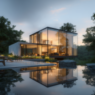 A sleek modern glass house glows warmly at dusk, its clean lines reflected perfectly in the still water beside it, surrounded by trees and minimal landscaping that enhance its contemporary, tranquil atmosphere. Download this free AI Generated contemporary design, evening, glass architecture, and luxury home stock image by Image Maker (@ImageMaker).