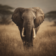 A powerful African elephant walks forward through tall golden grass, its textured skin and curved tusks sharply defined. Soft, muted tones and a blurred savanna background emphasize the animal’s strength and quiet majesty. Download this free AI Generated african elephant, elephant, grassland, and mammal stock image by Image Maker (@ImageMaker).