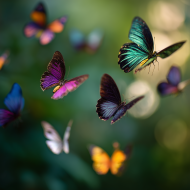 A group of vividly colored butterflies flutters through a softly blurred green background. Their wings display rich shades of blue, purple, orange, and teal, creating a dreamy and lively scene full of motion and natural beauty. Download this free AI Generated bokeh, butterflies, colorful wings, and flight stock image by Image Maker (@ImageMaker).
