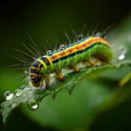 A vibrant caterpillar crawls along a green leaf covered in fresh dew drops. Captured in macro detail, its bright stripes and fine hairs stand out against a soft, blurred natural background. Download this free AI Generated caterpillar, colorful, dew drops, and insect stock image by Image Maker (@ImageMaker).