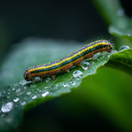 A detailed macro shot of a striped caterpillar crawling along a glossy green leaf covered in clear dew drops. Its yellow, black, and green bands and fine hairs are sharply focused against a soft, dark natural background. Download this free AI Generated caterpillar, colorful stripes, dew drops, and insect stock image by Image Maker (@ImageMaker).