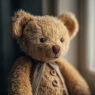 A close-up portrait of a classic teddy bear with soft brown fur, button details, and a gentle expression. The plush toy is softly lit indoors, evoking warmth, nostalgia, and childhood comfort. Download this free AI Generated childhood, comfort, cute, and nursery stock image by Image Maker (@ImageMaker).