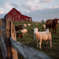 A peaceful farm scene featuring sheep and lambs grazing in a green pasture alongside chickens and a cow, with a weathered red barn in the background. Soft evening light adds warmth to this rustic countryside setting. Download this free AI Generated barn, chickens, countryside, and cow stock image by Image Maker (@ImageMaker).