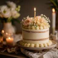 An elegant birthday cake decorated with smooth buttercream and delicate floral accents sits on a stand, topped with a single lit candle. Soft candlelight and muted tones create a warm, intimate celebration setting. Download this free AI Generated birthday cake, buttercream, candle, and celebration stock image by Image Maker (@ImageMaker).