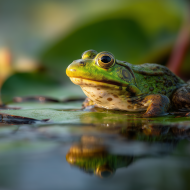 A close-up view of a green frog resting calmly on a lily pad in a quiet pond. The frog’s glossy eyes, textured skin, and reflection in the water are highlighted against a softly blurred natural background. Download this free AI Generated amphibian, frog, green frog, and lily pad stock image by Image Maker (@ImageMaker).