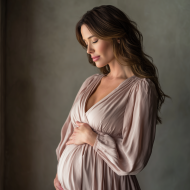 A serene maternity portrait of a pregnant woman in a flowing blush dress, gently cradling her belly. Soft natural light highlights her calm expression, creating an intimate and elegant celebration of motherhood. Download this free AI Generated elegant dress, expecting mother, maternity, and motherhood stock image by Image Maker (@ImageMaker).