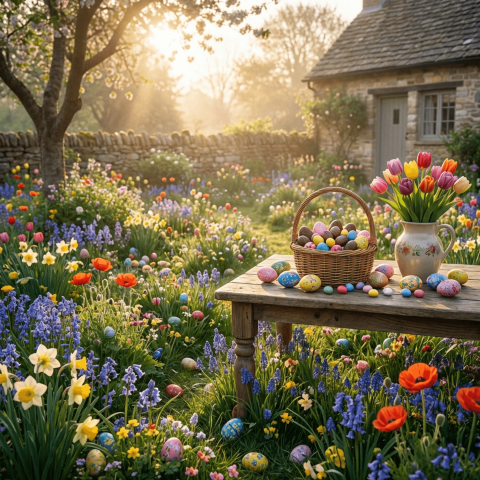 A picturesque Easter scene in a lush garden with vibrant flowers and colorful eggs. A wooden table features painted eggs, chocolates, and tulips, all bathed in soft morning light, creating a warm holiday atmosphere. Download this free AI Generated 8k resolution, chocolates, detailed scene, and easter stock image by Unreal Images (@Unreal).
