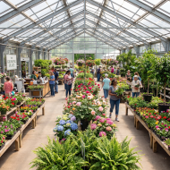 A vibrant garden center bustling with diverse shoppers, filled with colorful flowers and lush plants. Sunlight filters through a glass roof, creating a lively and natural atmosphere. Captured in ultra-detailed 8K resolution. Download this free AI Generated 8k resolution, aesthetic arrangement, diverse people, and garden center stock image by Unreal Images (@Unreal).