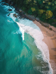 Aerial view of a tropical beach featuring turquoise waters and gentle waves washing ashore. The sandy coast is bordered by lush greenery and rocky formations, creating a picturesque landscape. Download this free AI Generated beach, coast, illustration, and island stock image by Unreal Images (@Unreal).
