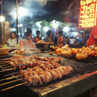 Thank @ImageMaker for sharing this free AI image, the easiest way is on social networks.Street Food Skewers Grilling at Night Market